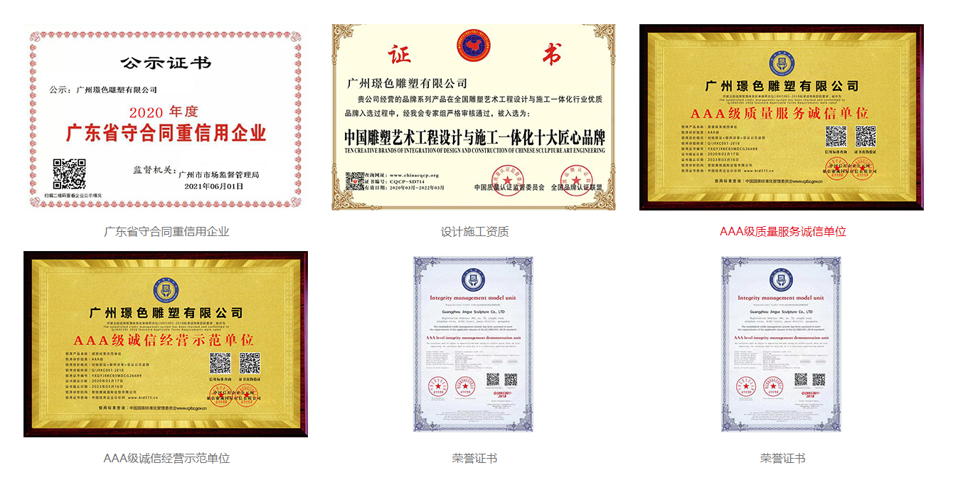 广州璟色雕塑有限公司成立于2012年,是中国雕塑艺术工程设计与施工一体化十大匠心品牌,被评为AAA级质量服务诚信单位及AAA级诚信经营示范单位,多年连续获得“广东省守合同重信用企业”等荣誉称号。多年来致力专注于城市公共艺术创意、制作、安装施工一体化的解决方案服务商,主要承接异型钢构造型、大型IP形象雕塑、广场雕塑、城市公共雕塑、主题公园艺术造型、酒店软装艺术饰品、园林景观雕塑小品、校园文化雕塑以及浮雕壁画工程、艺术家具等。